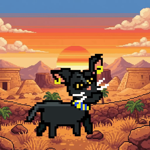 Sphinxel es un sprite de gato egipcio negro en estilo 2D pixel art, inspirado en la majestuosidad de los felinos sagrados del Antiguo Egipto. Su apariencia transmite misterio y divinidad, evocando la figura de un dios protector.