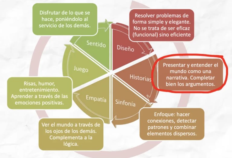 En su charla TED Dan Pink. (2009) destaca la estrategia ROWE(Results Only Work Environment) empleada por Atlassian una empresa de tecnología Australiana, que se basa en enfocarse en los resultados en lugar de las horas trabajadas, permitiendo a los empleados ser más creativos y productivos al trabajar en cosas que les interesan. Además, resalta la importancia de ver el mundo como una narrativa, lo que nos ayuda a conectar emocionalmente y darle significado a lo que hacemos. En un mundo lleno de automatización y abundancia, combinar la lógica con la creatividad y la empatía es clave para sobresalir y generar impacto real.